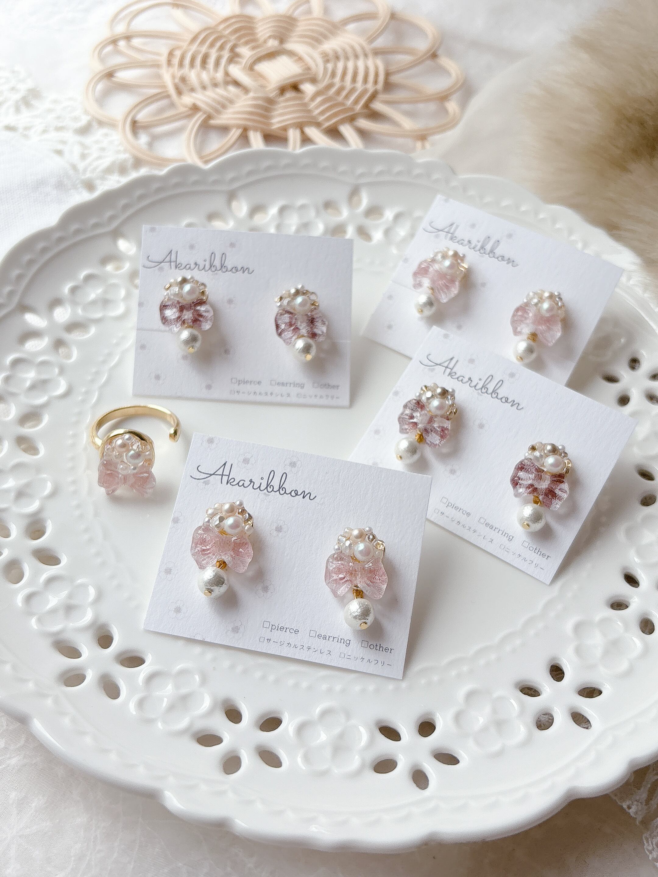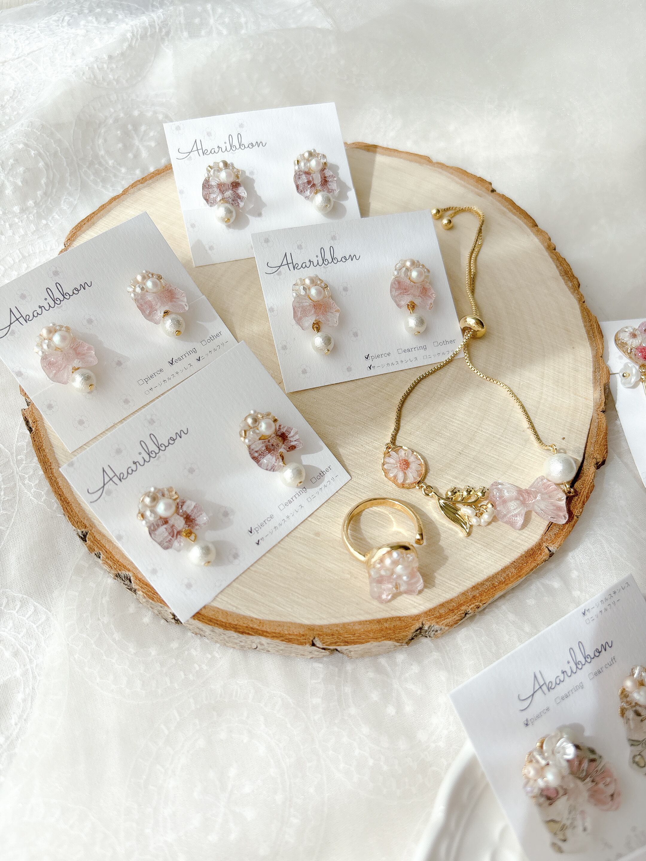 ⋈ 1つ1つ手作業で製作していますので、色や形、お花やビーズの配置に違いがある場合がございます。ご了承ください。