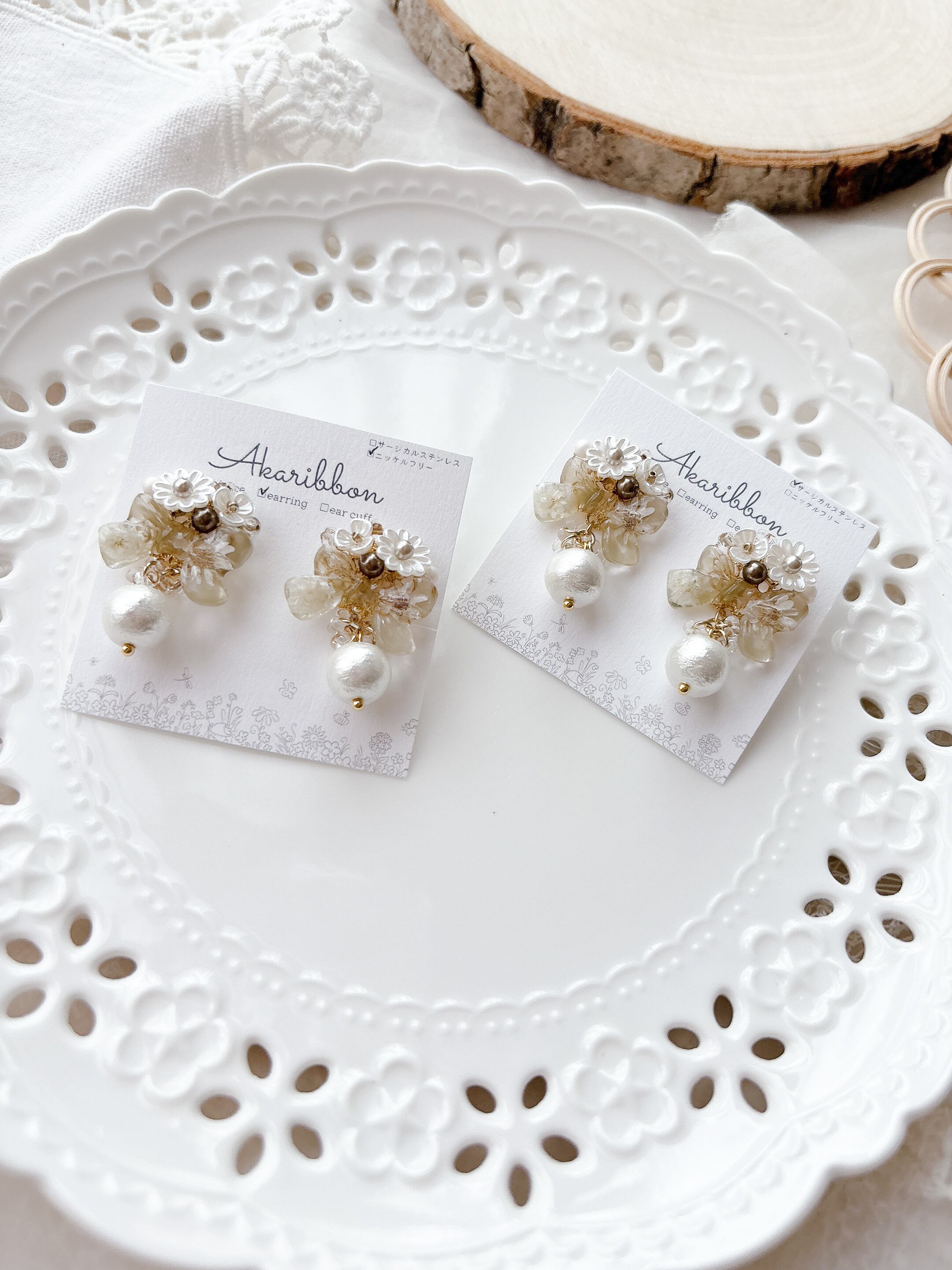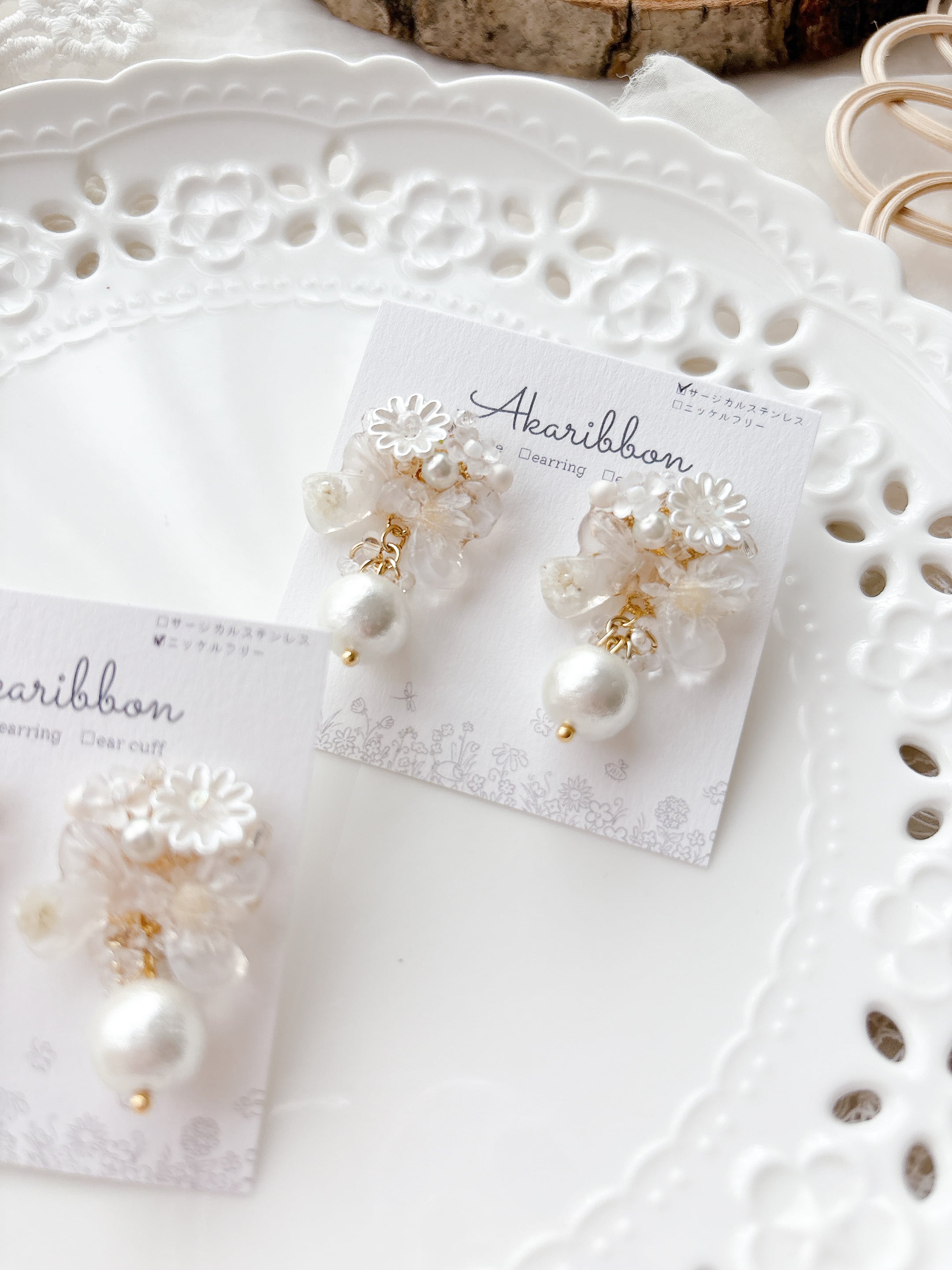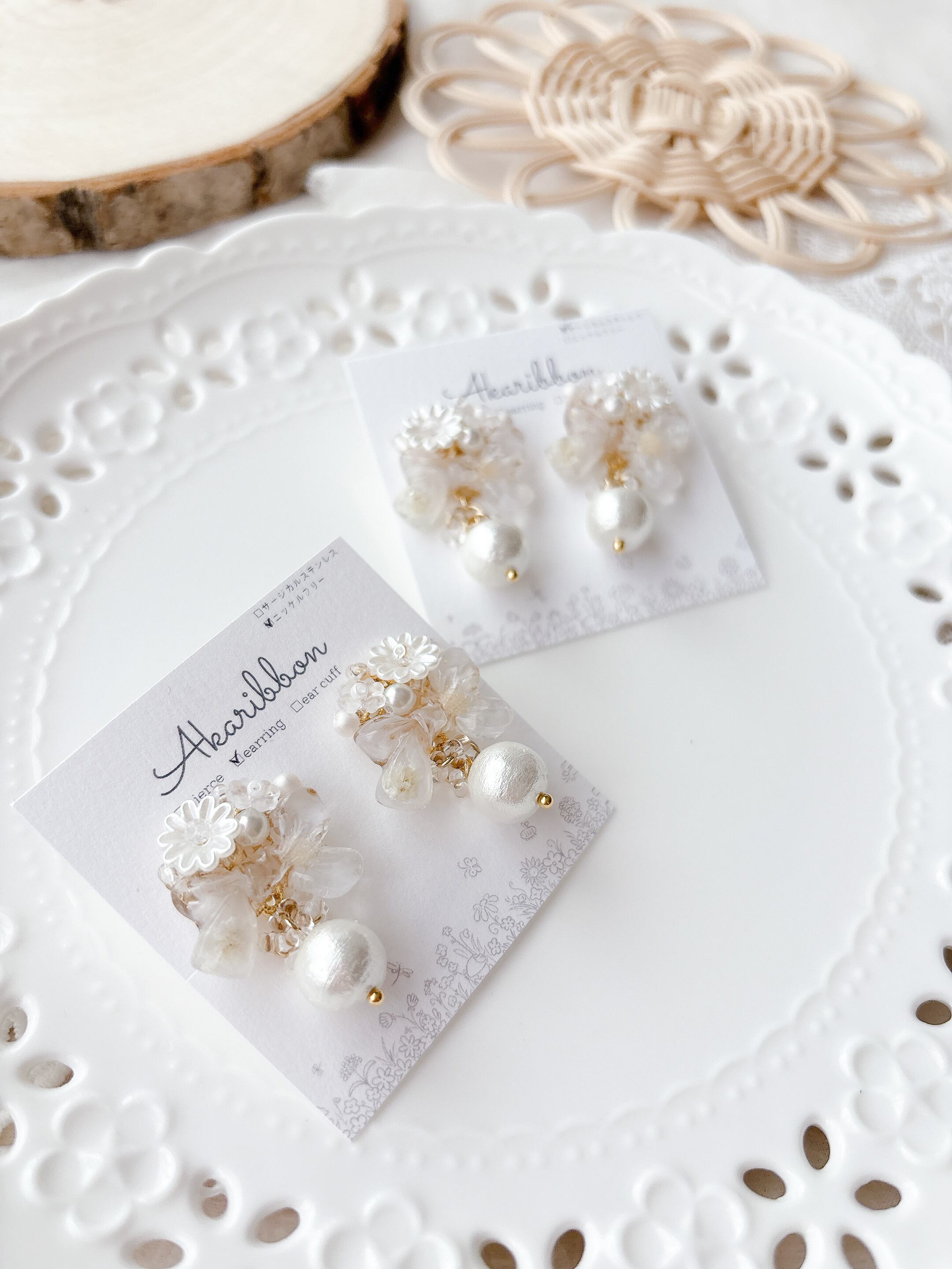 コットンパールが揺れる花束ピアス/イヤリングです。