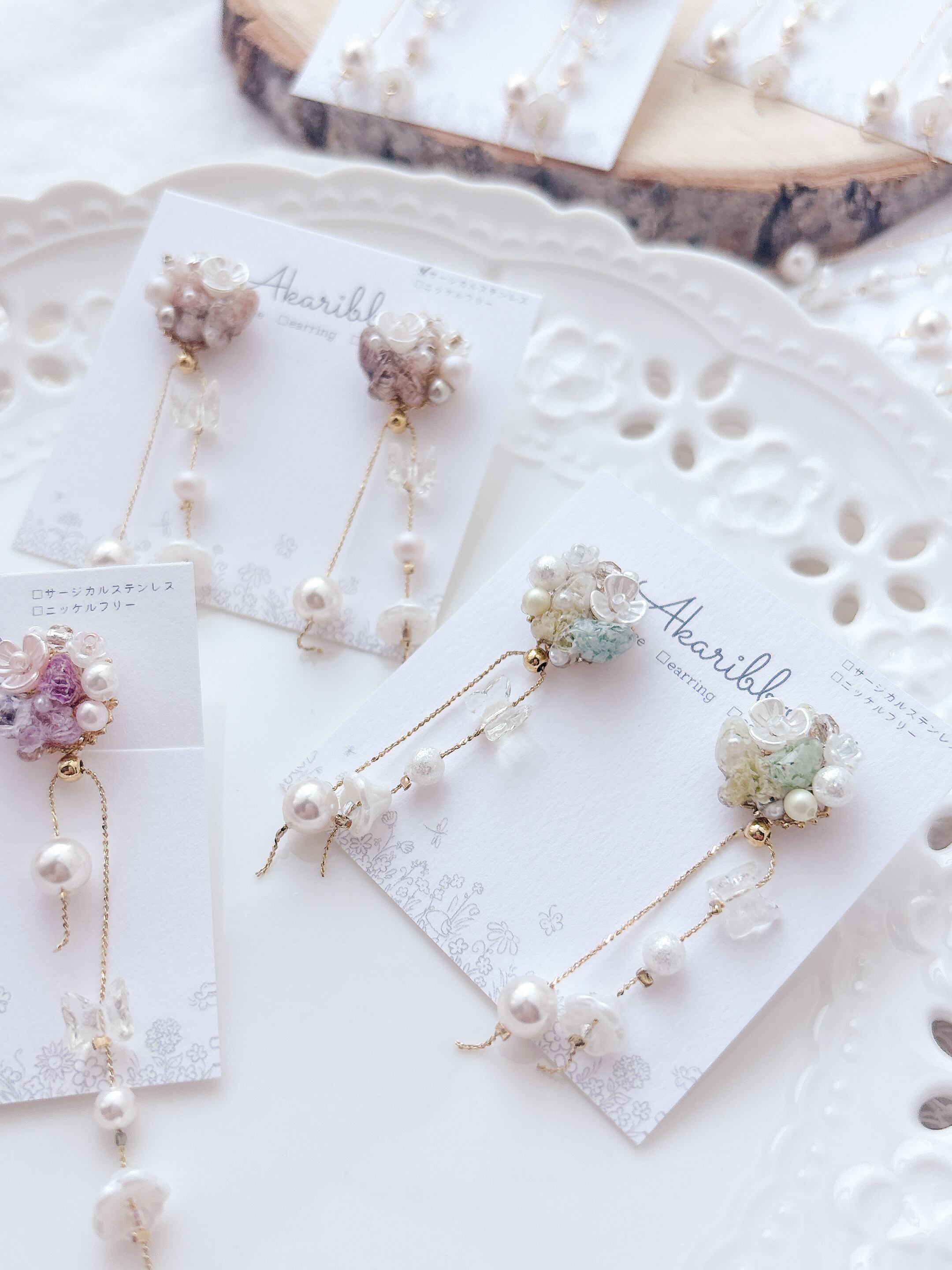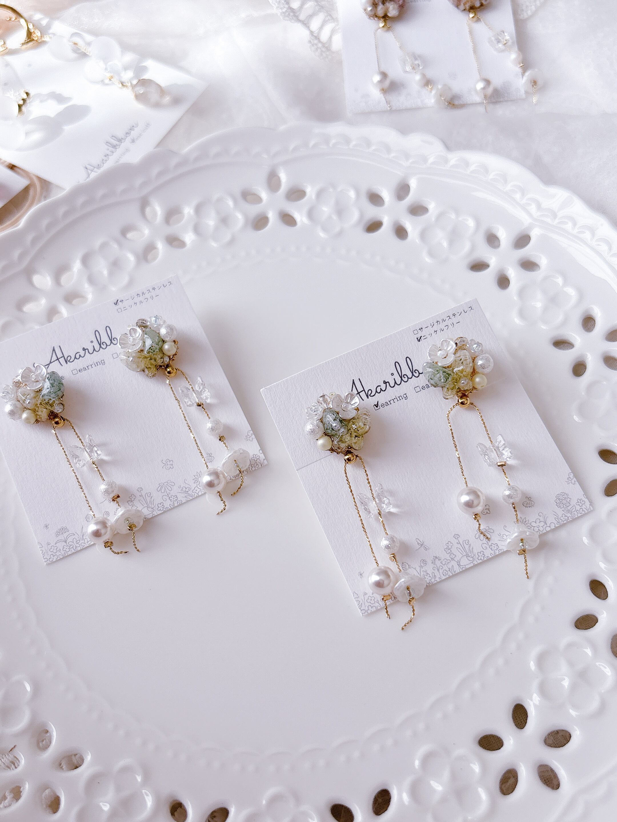 イヤリングはネジバネイヤリング、低アレルギーのニッケルフリーメッキを使用しており、全てのイヤリングにはシリコンカバーをお付けしています。