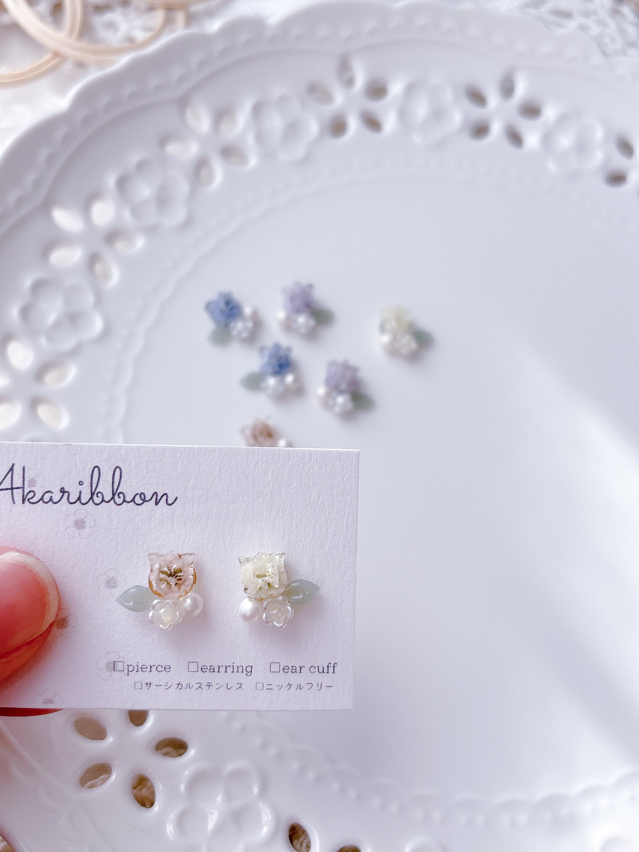 イヤリングはネジバネイヤリング、低アレルギーのニッケルフリーメッキを使用しており、全てのイヤリングにはシリコンカバーをお付けしています。